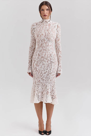 Lace meets sleek tailoring in this autumn-winter dress, balancing elegance and sensuality. The high-waist bodycon cut accentuates your curves, while the mermaid hem adds a graceful flair—ideal for parties and formal events.