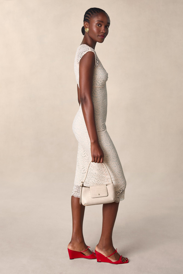 Introducing the Nora Floral Lace Bow Midi Dress, a must-have for any occasion. Made with delicate floral lace and adorned with a charming bow, this dress exudes elegance and femininity. With a flattering midi length, it offers both style and comfort. Perfect for weddings, parties, or a night out.