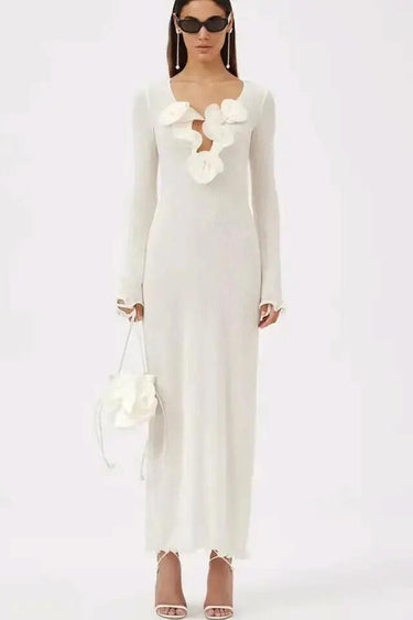Elevate your wardrobe with our maxi dress featuring a plunging V-neckline and long sleeves. The ruffled cuffs and hem add a romantic touch, while front flower details enhance its feminine charm. The semi-sheer polyester fabric drapes beautifully, offering a relaxed fit with medium stretch.