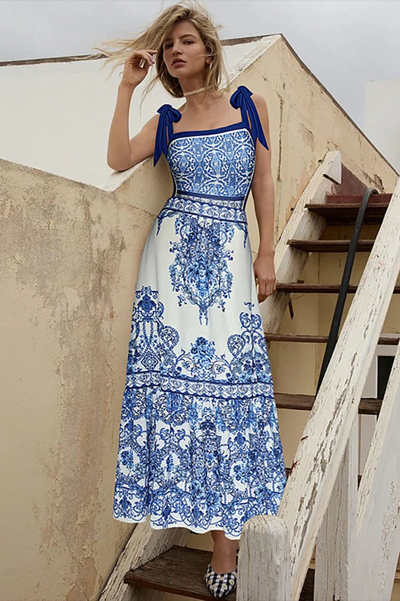This blue boho print one-piece swimsuit set features delicate bow tie shoulder straps and an intricate ethnic-inspired pattern that brings a relaxed, free-spirited vibe to your beachwear. The soft blue tones and detailed print evoke a sense of wanderlust, while the adjustable ties add a touch of charm and a customizable fit. Crafted from high-quality stretch fabric, the swimsuit hugs the body comfortably and flatters your shape, making it both stylish and easy to wear for any warm-weather escape.