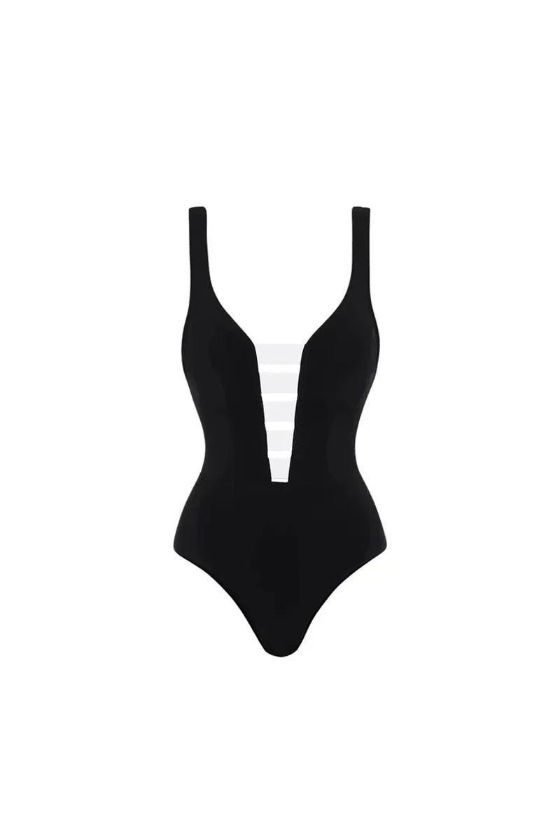 Clean black and white contrast delivers a modern, structured look contouring panels enhance and flatter the figure soft, stretchy material ensures comfort and shape retention minimalist design fits effortlessly into a curated swimwear collection.