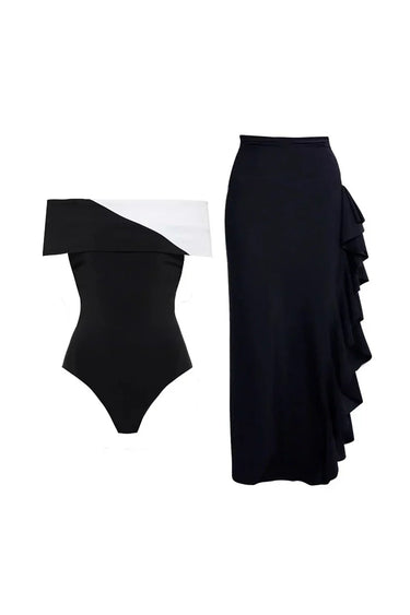 This black and white colorblock one-piece swimsuit set captures the essence of modern minimalism with its clean lines and striking contrast. Designed in a sleek silhouette, the suit features precise black and white paneling that creates a sculpted, contour-enhancing effect. The minimalist aesthetic makes it effortlessly chic and versatile, while the soft, high-stretch fabric provides a comfortable and flattering fit. A staple for anyone seeking timeless style with an Instagram-worthy edge.