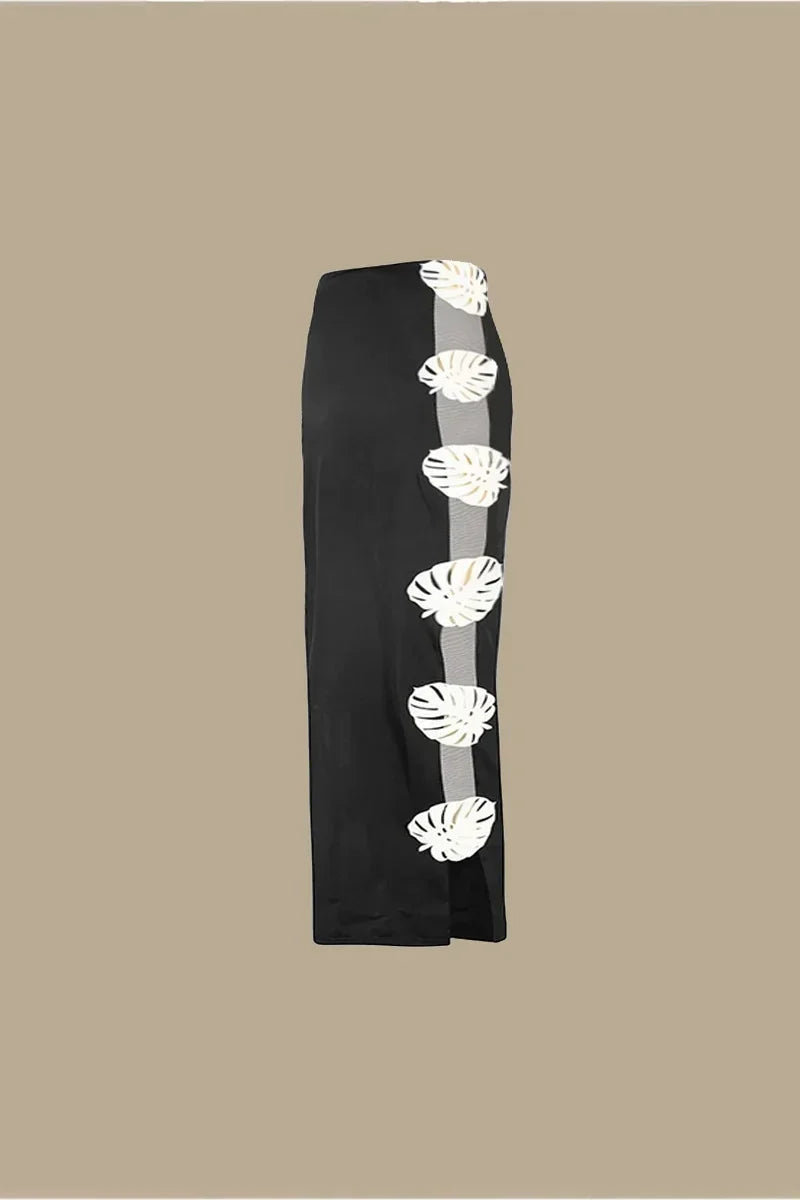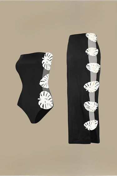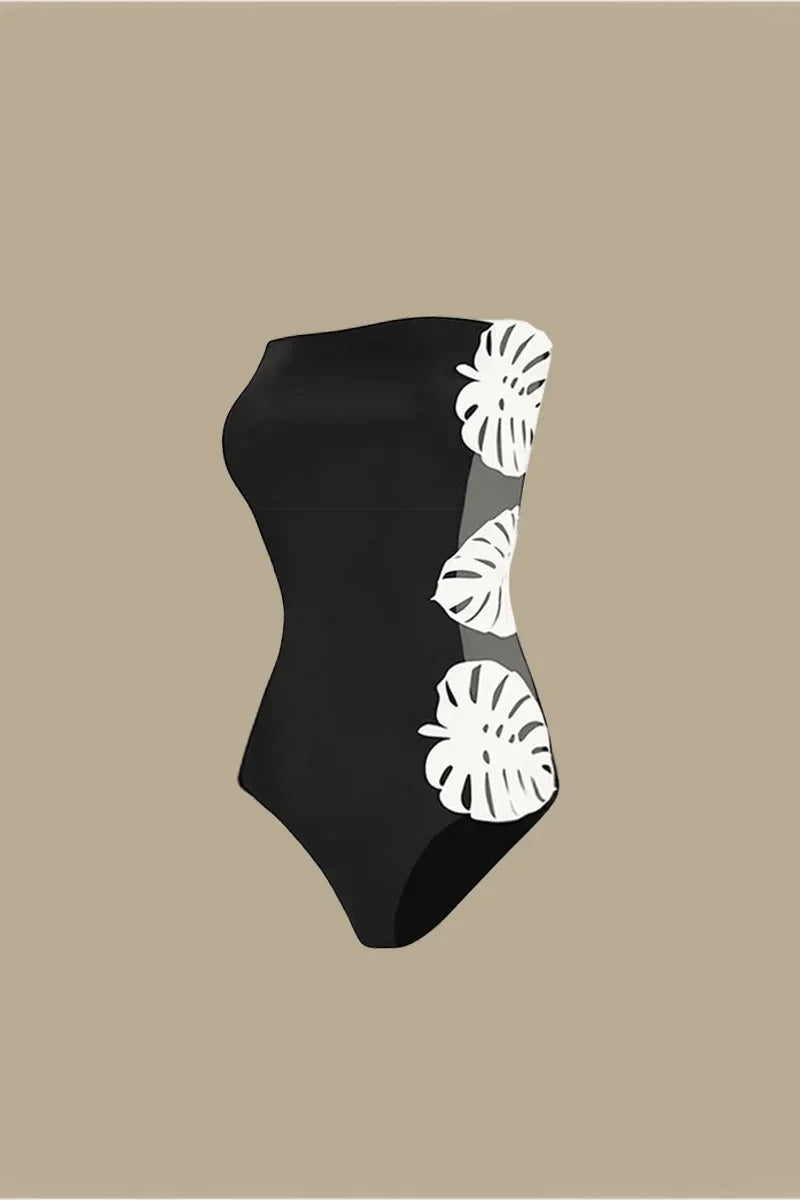 Bold and stylish, this strapless one-piece swimsuit features striking black-and-white leaf patchwork and daring cutout designs. Created for confident trendsetters, it blends tropical energy with a sleek, high-fashion edge.