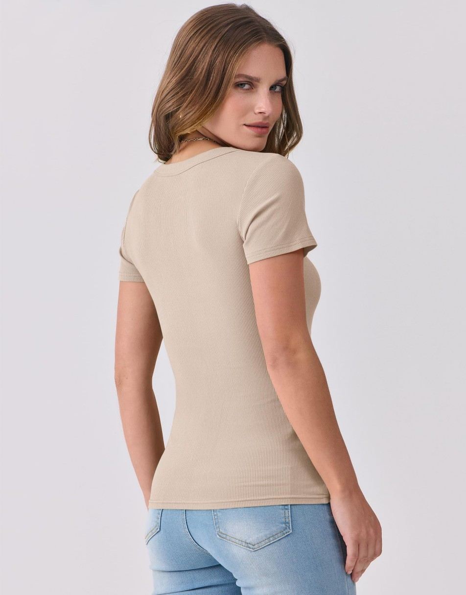 • Design: Classic V-neckline with short sleeves and ribbed texture