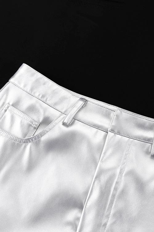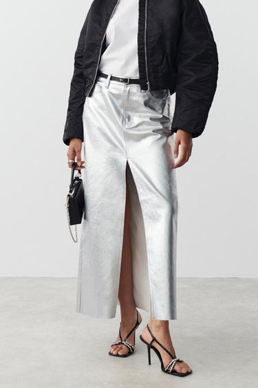 This striking ankle-length skirt features a metallic coated finish and a high slit for a bold, fashion-forward look. The high waist and medium stretch vegan leather ensure a flattering and comfortable fit. The front zipper provides a sleek and functional closure. Ideal for making a statement, this skirt pairs beautifully with both casual and dressy tops.