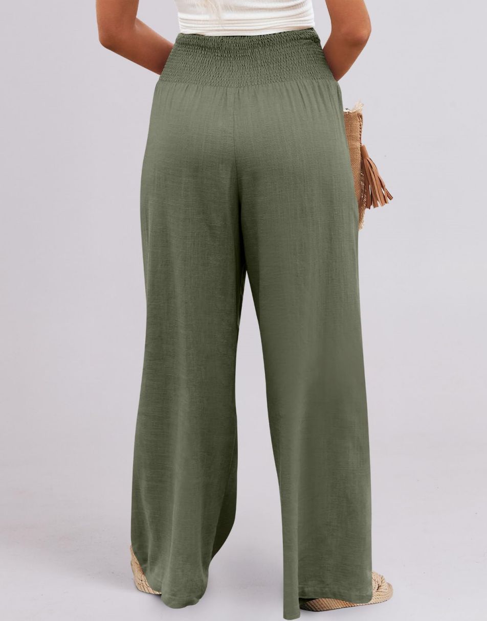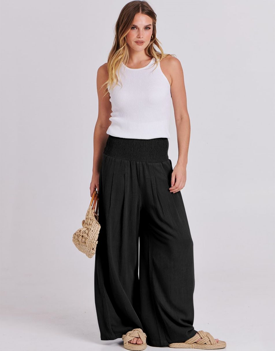 - Fit: Loose wide-leg silhouette with smocked high waist